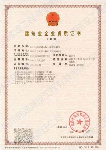 四川向通建設工程有限責任公司 四川向通建設工程有限責任公司成立于2007年,注冊資本金5060萬元,是一家專業從事瀝青混合料生產、專業分包以及市政道路、公路、路基工程專業施工建設的企業。公司注冊地址及生產廠區位于成都市雙流區金橋鎮茂生街115號,總占地面積約120畝;辦公地址位于雙流區海濱城海濱廣場7座11樓。公司生產廠區(雙流金橋)現有LB-5000型瀝青混合料拌合樓1套,每小時瀝青混合料生產量可達380噸。此外,根據項目需要,公司在多地建立4000型拌合站以服務施工(廣安齊福、達州、綿陽等),每小時瀝青混合料生產量為320噸。各種國內外道路施工機械:攤鋪機、壓路機、銑刨機、灑布車、封層車、吊車、拖車、等70余臺,可滿足各種道路施工需求。公司近100輛保溫運輸車輛均安設保溫板、加塞保溫棉、覆蓋棉絮和隔熱防水雨篷,有效減少瀝青混合料在運輸過程中的溫度流失進而保證瀝青路面的施工質量。 公司目前擁有眾多優秀的技術人才,成熟的市場渠道,良好的企業聲譽?,F有各專業施工人才共計79人;5支專業的施工班組可根據現場的具體情況制定實施性施工方案。今后公司將竭誠為各界客戶提供出色的產品和服務及具有競爭性的價格和具有創新精神的高效解決方案。 公司曾經榮獲:新津鄧雙段被新津縣政府評為“優良工程”;雙流宗申大道被雙流縣政府評為“優良工程”;成都后花園被成都市政府評為“重合同守信譽單位”;被三一重工評為“有遠見單位”。并在2018年1月被中國五冶集團評為“優秀供方”;同年3月被四川交投評為2017年度“優秀合作單位”的榮譽。榮譽的背后是我們公司所有員工堅持不懈的努力。 作為現代化的企業,公司將以技術為切入點,以信譽為支撐點,以市場為著眼點,促進管理創新和技術創新。因此我公司能在短時間內迅速發展成為一家擁有各類中大型施工機械設備的公司。在今后的工作中我們將借用現代電子信息溝通的便利為公司的發展助力,同時將秉承發揚以往的團結拼搏精神,推動公司成為“快穩型”發展的企業。 在未來的發展過程中,四川向通始終秉承“以質量求生存,以信譽求發展”的企業管理理念,以“啟后為先創佳績,爭做路建行業標”的企業宗旨與建設單位建立合作關系,創造更加輝煌燦爛的明天! 四 川 向 通 建 設